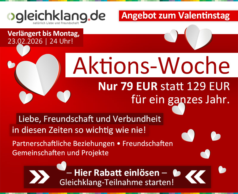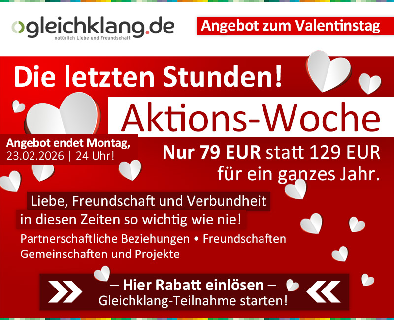 Lieber Guido, liebes Gleichklang Team! Ich bin sehr dankbar für Eure Arbeit! Sie ist einzigartig! Ich habe meinen Partner gefunden! Im Alter von 70! Stellt Euch vor. Ich würde sehr gern bei weiter dabei sein, und zwar in der Freundschaft-Kategorie'. Ich freue mich sehr auf Eure Antwort, Alles Liebe.