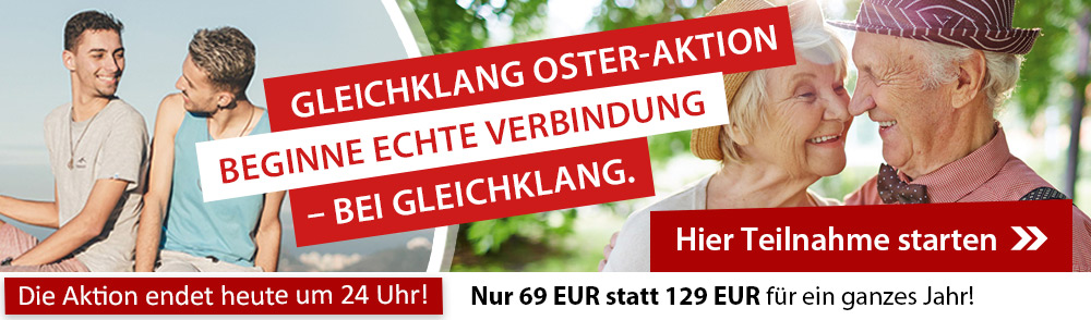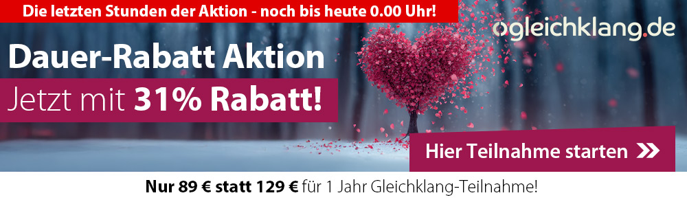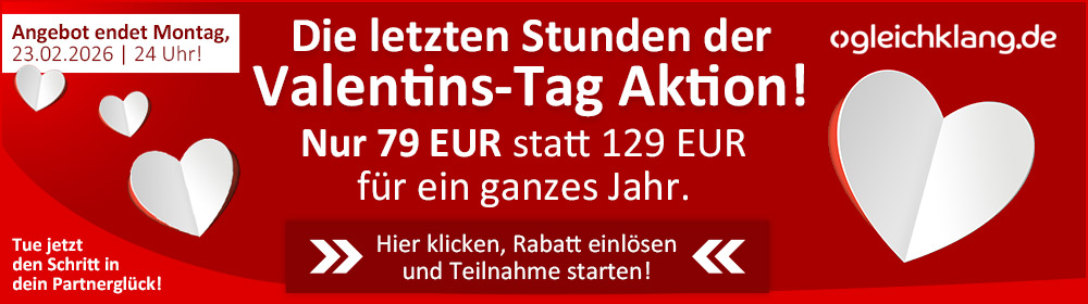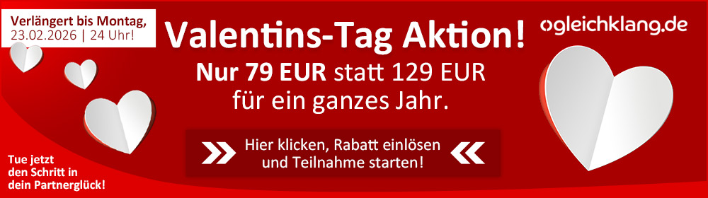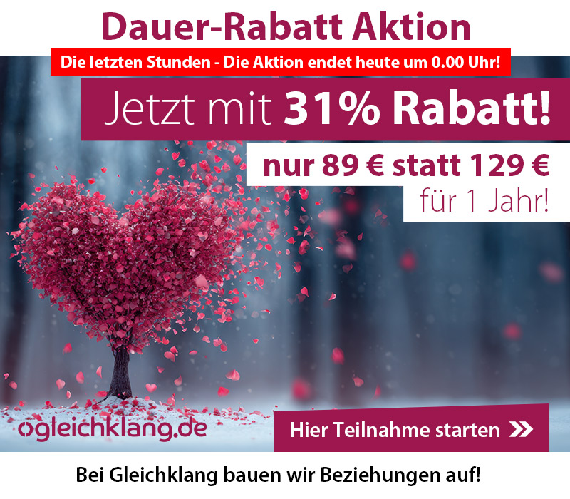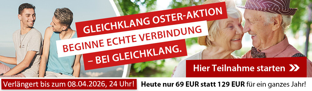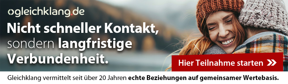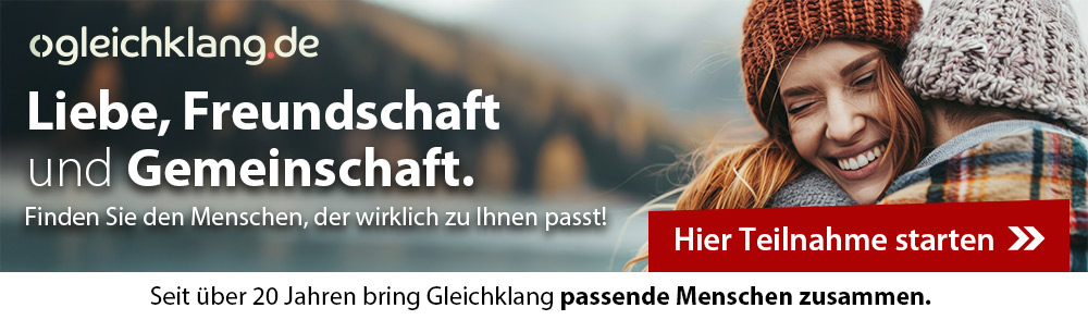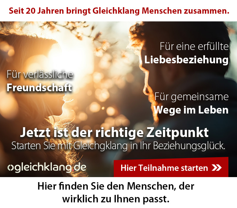 Lieber Guido, liebes Gleichklang Team! Ich bin sehr dankbar für Eure Arbeit! Sie ist einzigartig! Ich habe meinen Partner gefunden! Im Alter von 70! Stellt Euch vor. Ich würde sehr gern bei weiter dabei sein, und zwar in der Freundschaft-Kategorie'. Ich freue mich sehr auf Eure Antwort, Alles Liebe.
