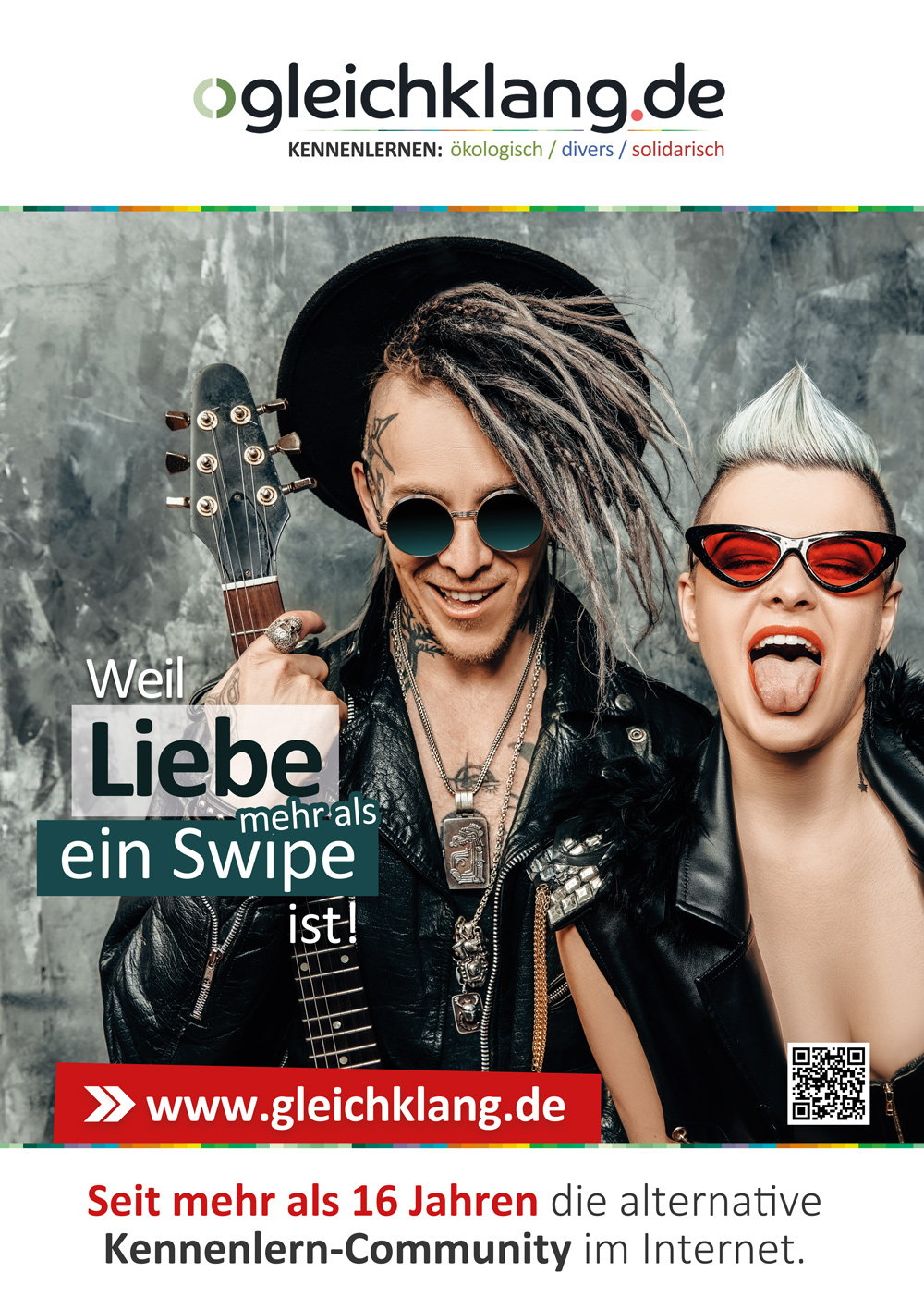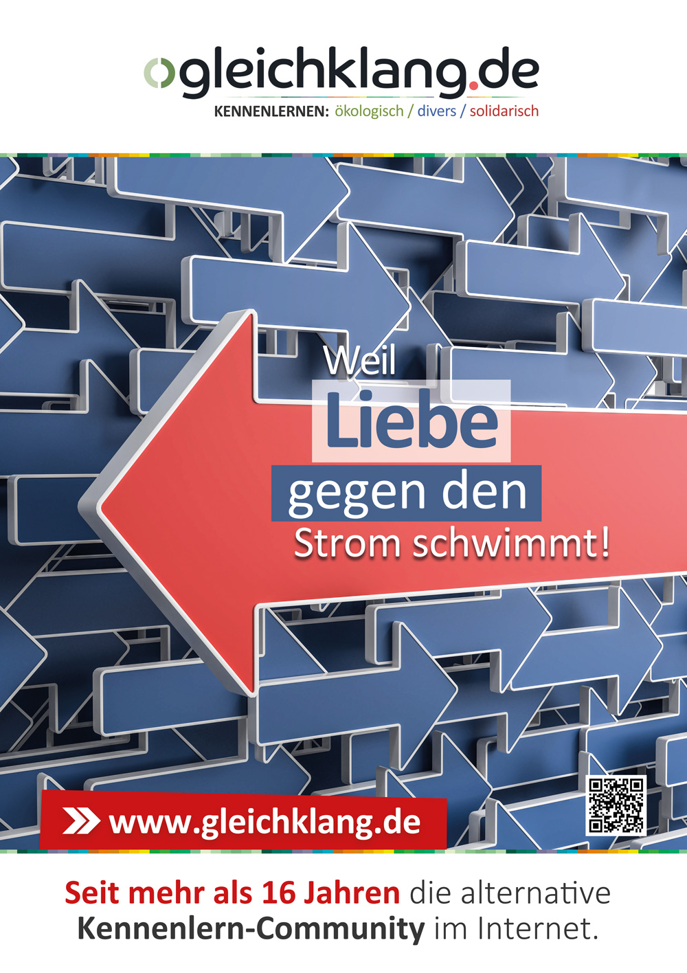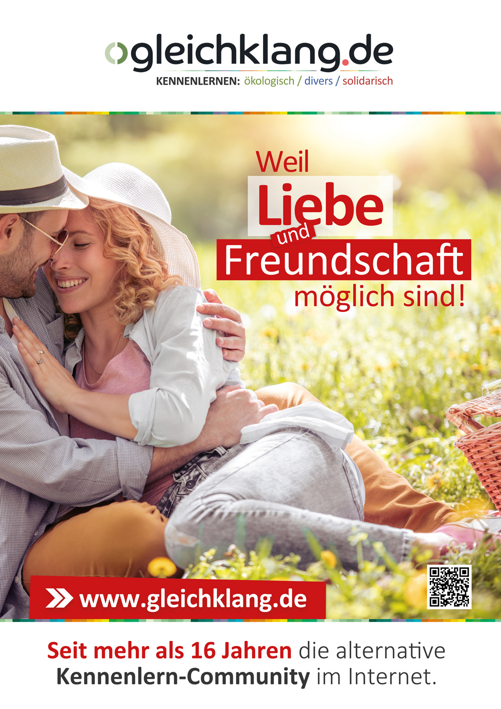 Die Gleichklang-Community ist eine Mitglieder-Community und Kennenlern-Gemeinschaft von derzeit etwas über 20.000 Mitgliedern, die nach Partnerschaft, Freundschaft oder Reisepartnern suchen und denen Ökologie, Mitgefühl, Solidarität und Mitmenschlichkeit am Herzen liegen.