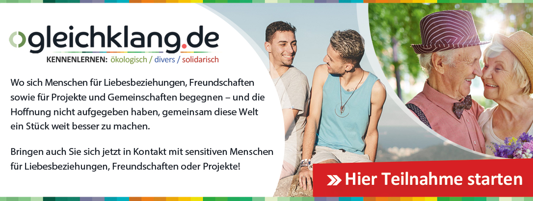 Ein wichtiger Unterschied zwischen Gleichklang und anderen Partnervermittlungen, Partnerbörsen, Singlebörsen oder auch den Dating-Apps ist die sozial-ökologische Orientierung von Gleichklang. Gleichklang ist eine Dating-Plattform, bei der sich vorwiegend solche Menschen begegnen, die Wert legen auf Ökologie, soziale Gerechtigkeit und einen solidarischen Umgang: